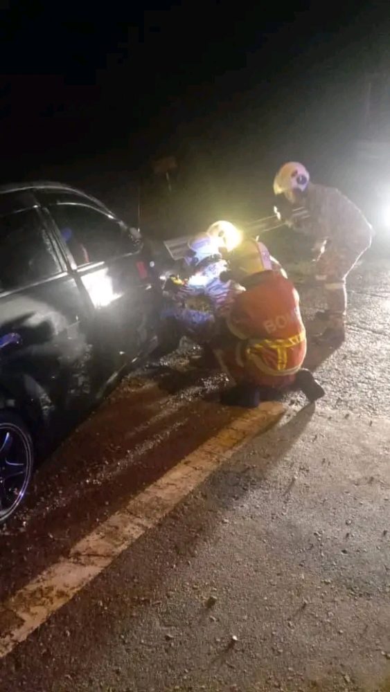“Pemandu, seorang lelaki, berjaya keluar dari kenderaan sebelum ketibaan pihak bomba. Seorang lagi mangsa, wanita dewasa, didapati tersepit pada bahagian kaki kiri di tempat duduk penumpang hadapan,” katanya menerusi kenyataan.