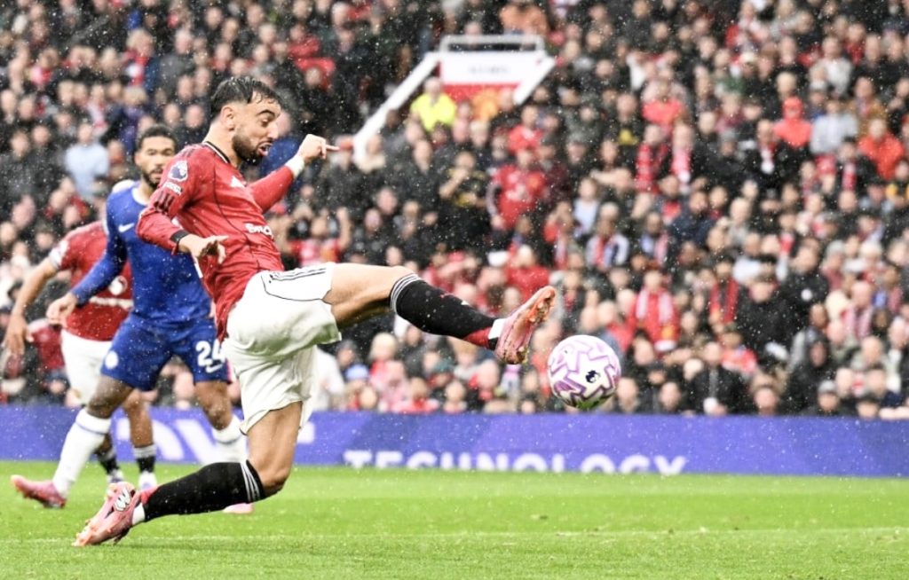 Pemain tengah Manchester United, Bruno Fernandes meledak gol pertama menentang Chelsea pada aksi Liga Perdana Inggeris di Old Trafford, Manchester. United menang 2-1. – Foto AFP