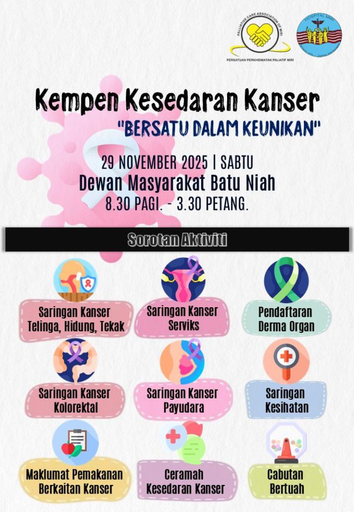 MIRI: Penduduk sekitar Niah dijemput memeriahkan Kempen Kesedaran Kanser bertemakan ‘Bersatu Dalam Keunikan’ yang bakal berlangsung Dewan Komuniti Niah, 29 November ini.