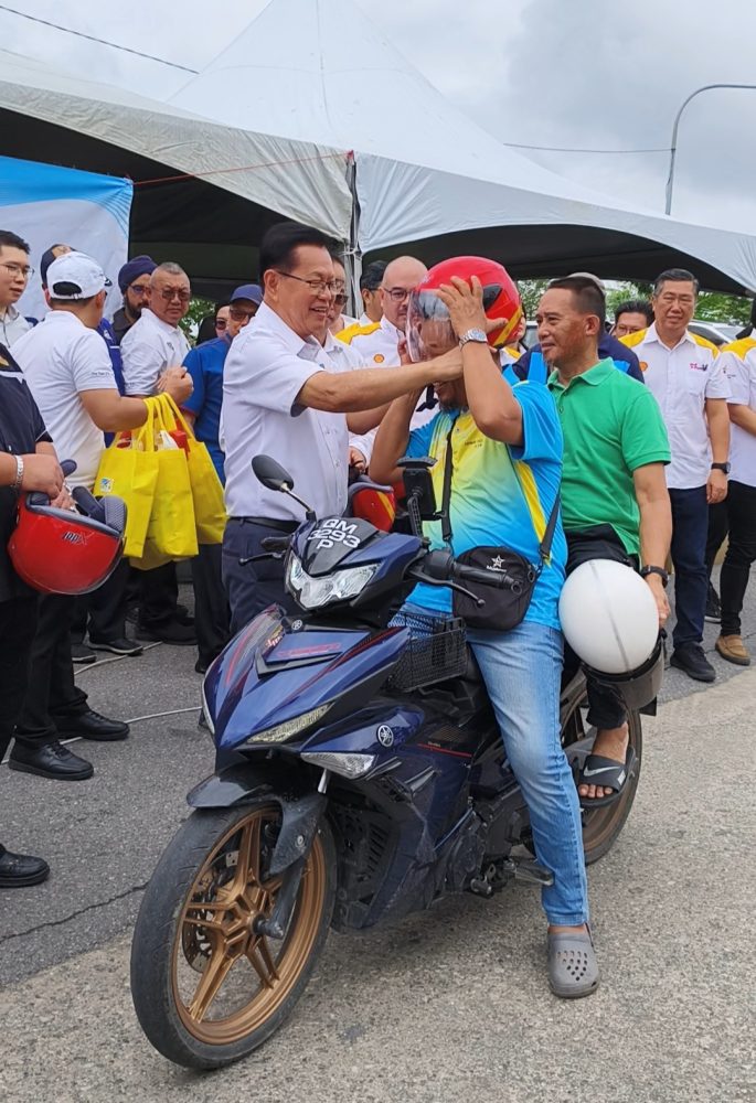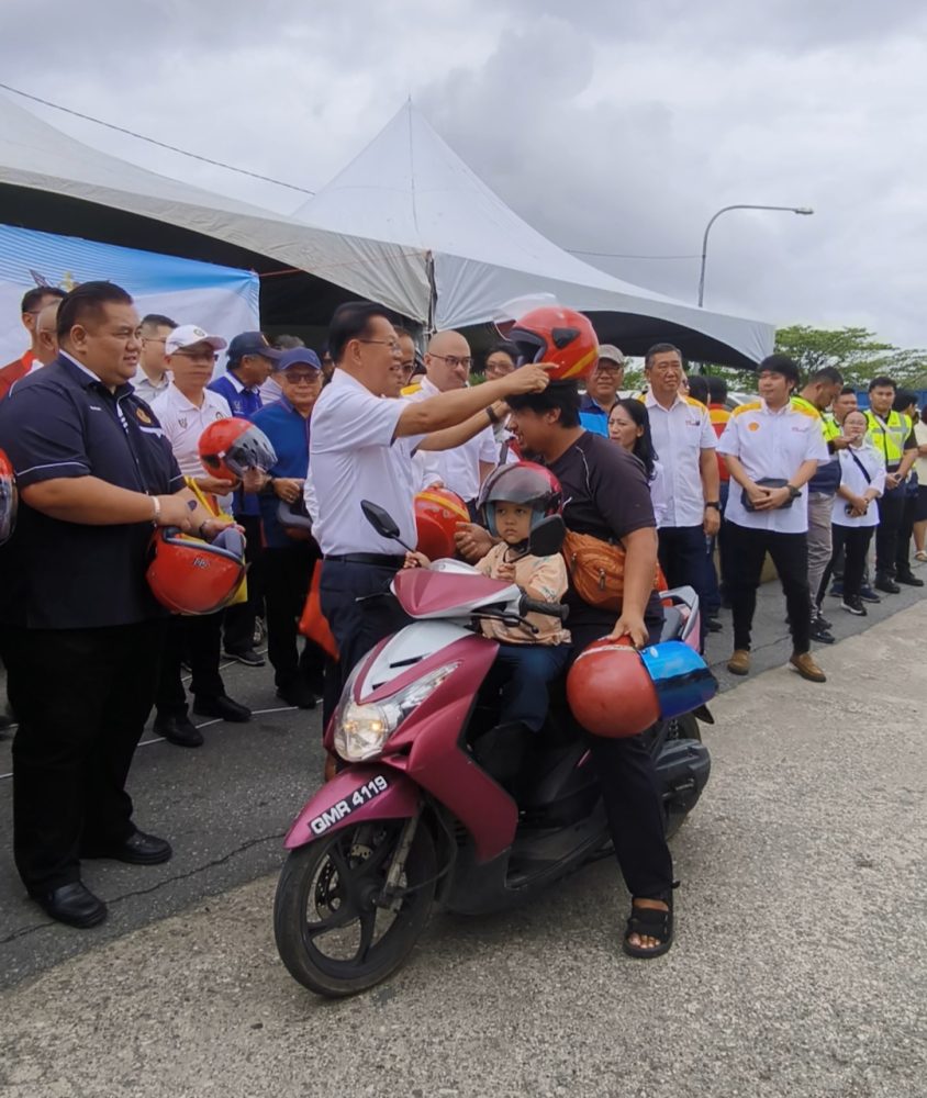 MENTERI Pengangkutan,Dato Sri Lee Kim Shin memakaikan topi keledar kepada salah seorang penunggang motosikal pada Program Kempen Keselamatan Jalan Raya Peringkat Bahagian Miri bersempena sambutan Tahun Baharu Cina 2026,  hari ini.