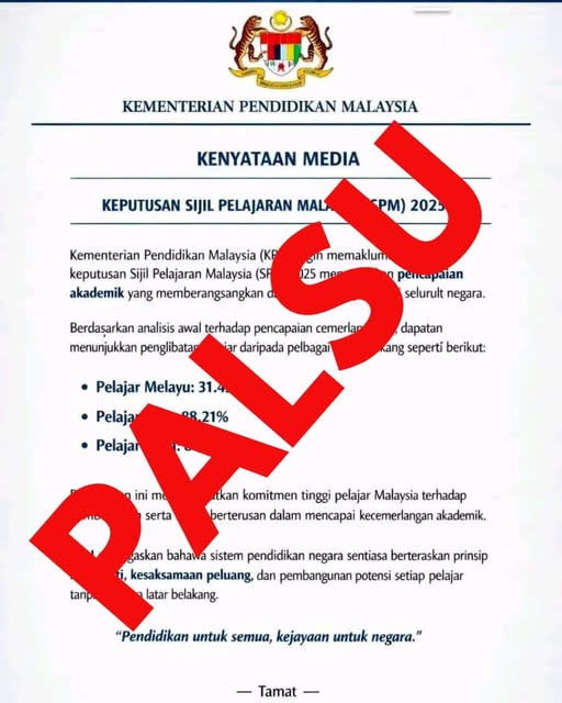 Kenyataan media itu mengandungi analisis mendakwa calon Melayu yang menduduki SPM 2025 merekodkan peratusan terendah berbanding Cina dan India.-Bernama