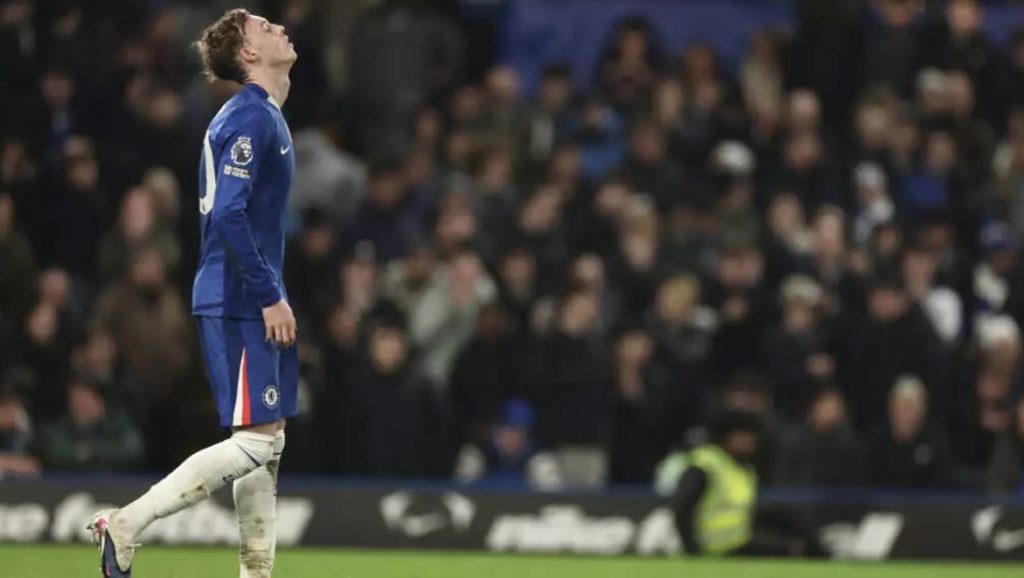 Cole Palmer dari Chelsea menunjukkan reaksi selepas mensia-siakan peluang menentang Leeds. Foto AFP