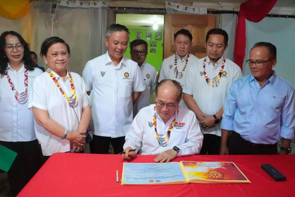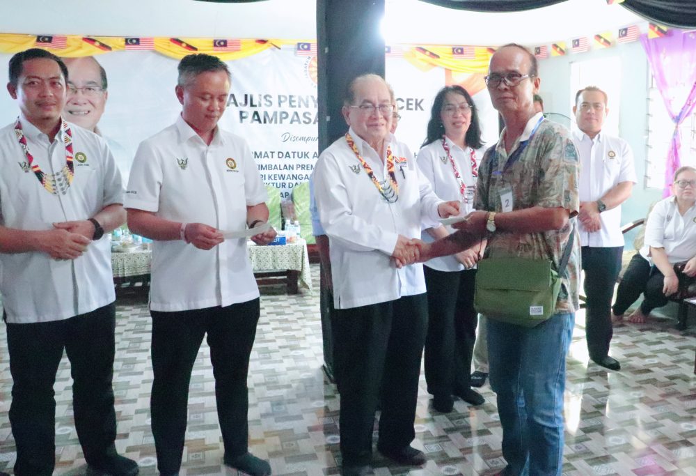 Datuk Amar Douglas Uggah Embas hadir pada Majlis Penyerahan Cek Pampasan Tanah Projek Naik Taraf Jalan yang diadakan di Rumah Empalie Jelom, Nanga Sela, Ulu Layar, di sini hari ini. Foto: Jabatan Tanah dan Survei Bahagian Betong