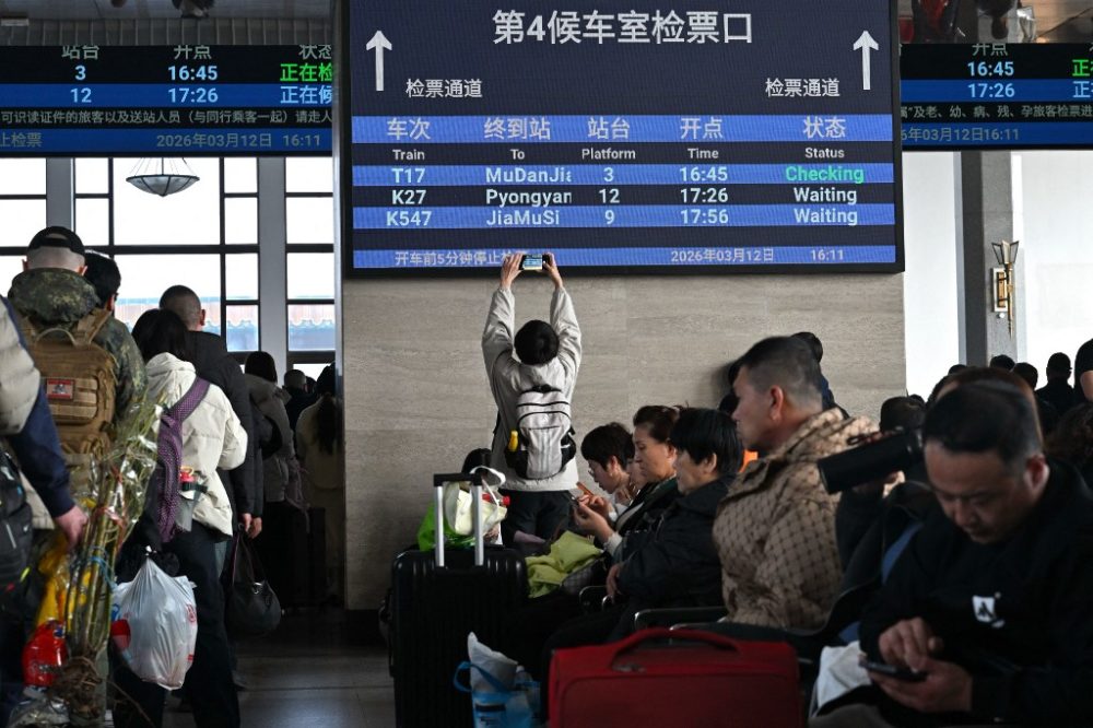 Beberapa pengunjung di stesen turut berkumpul di papan paparan pelepasan untuk mengambil gambar senarai perjalanan ‘Beijing ke Pyongyang’.