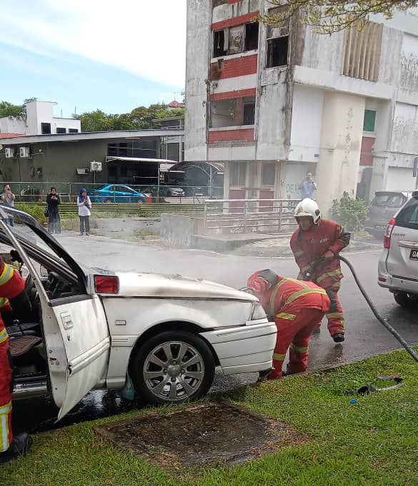 KUCHING: Sebuah kereta jenis saloon terbakar di bahagian enjin dalam kejadian berhampiran Majma Mall, Jalan P. Ramlee di sini pagi tadi.