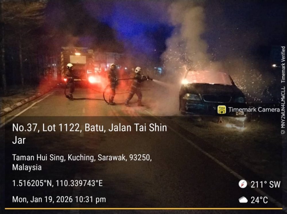 KUCHING: Sebuah kereta musnah sekitar 90 peratus dalam satu kejadian kebakaran di bahu Jalan Tai Shin Jar, Hui Sing di sini, malam ini.