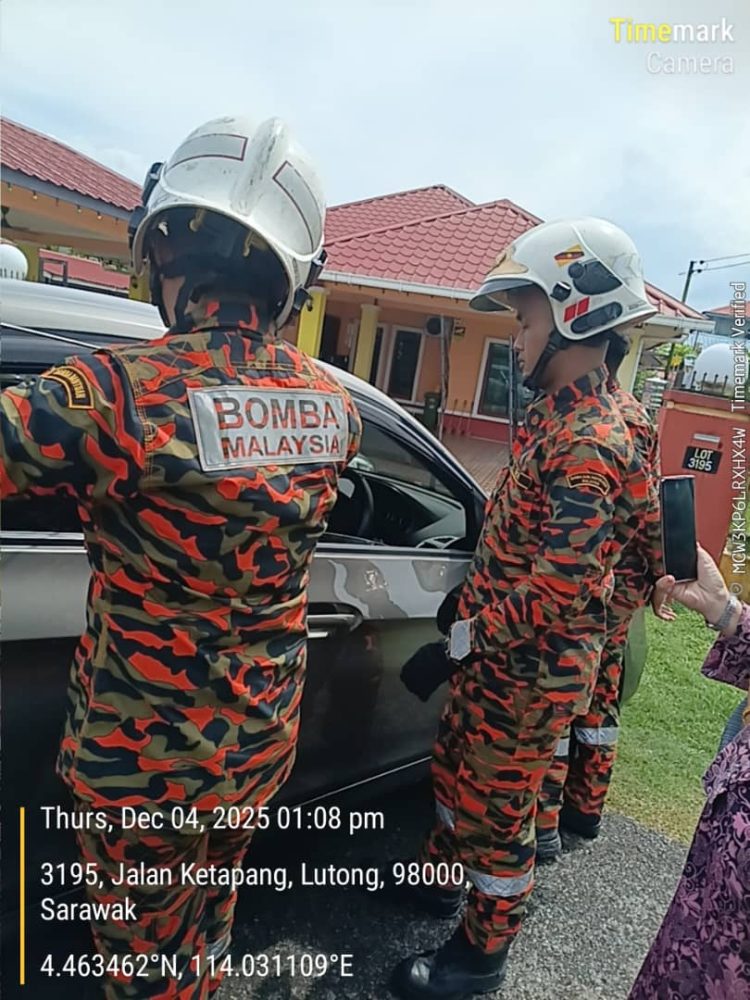 MIRI: Pasukan Balai Bomba dan Penyelamat (BBP) Lutong bergegas ke Tudan Fasa 5, tengah hari tadi, selepas menerima panggilan kecemasan berhubung sebuah kereta yang terkunci dengan kunci tertinggal di dalamnya.