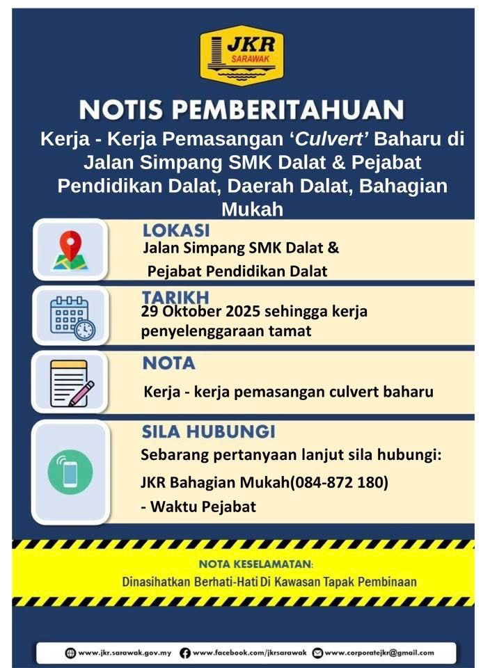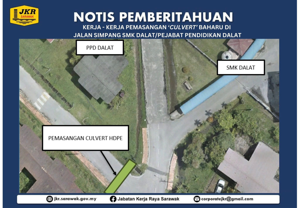 DALAT: Jabatan Kerja Raya (JKR) Bahagian Mukah memaklumkan bahawa kerja-kerja pemasangan ‘culvert’ baharu akan dilaksanakan di kawasan Jalan Simpang SMK Dalat dan Pejabat Pendidikan Dalat, Daerah Dalat, bermula 29 Oktober 2025 sehingga kerja penyelenggaraan selesai.