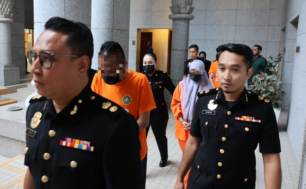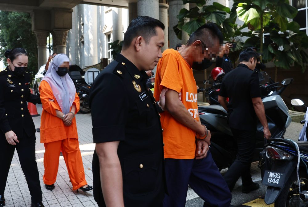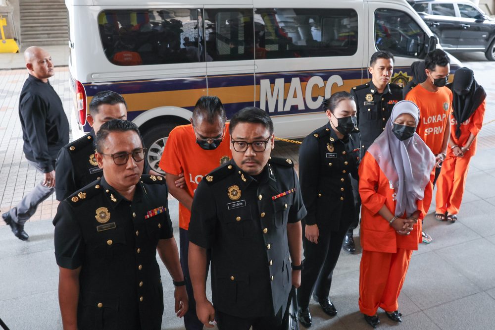 Terdahulu, keempat-empat individu yang lengkap berpakaian lokap warna jingga dan bergari itu tiba di pekarangan mahkamah kira-kira 9.30 pagi diiringi pegawai SPRM.
