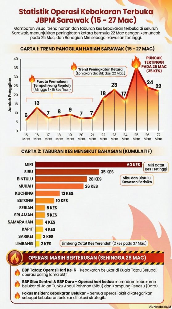 TREND kebakaran terbuka di Sarawak meningkat mendadak bermula 22 Mac lalu dengan kemuncak pada 25 Mac.