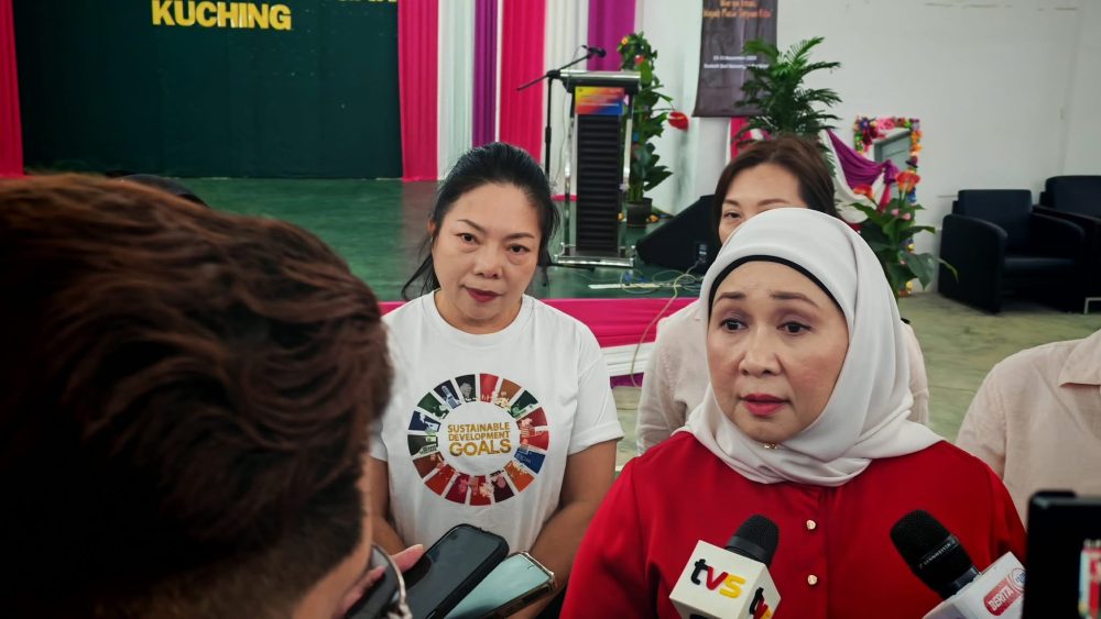 DATUK Sharifah Hasidah Sayeed Aman Ghazali ketika ditemui media selepas menyempurnakan penyampaian sumbangan Biro Wanita Saberkas kepada penghuni Rumah Seri Kenangan (RSK) Kuching di Batu 12, hari ini. Foto UKAS