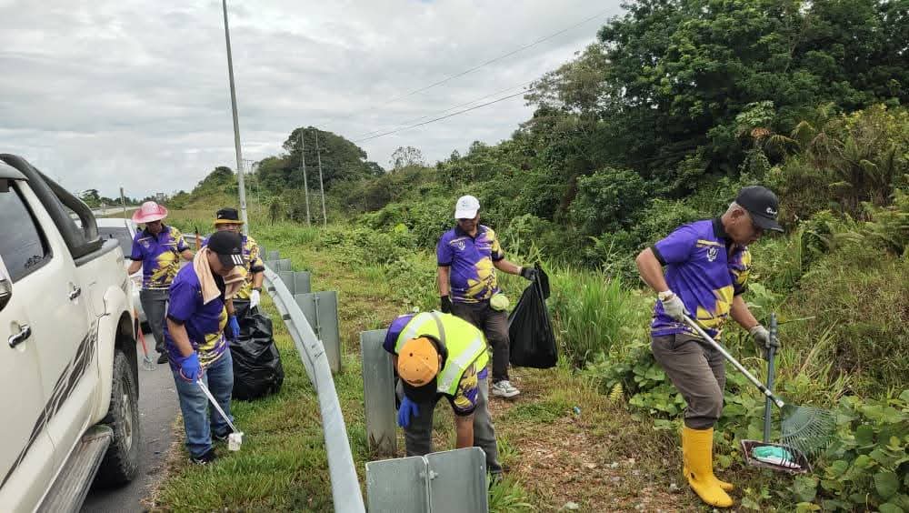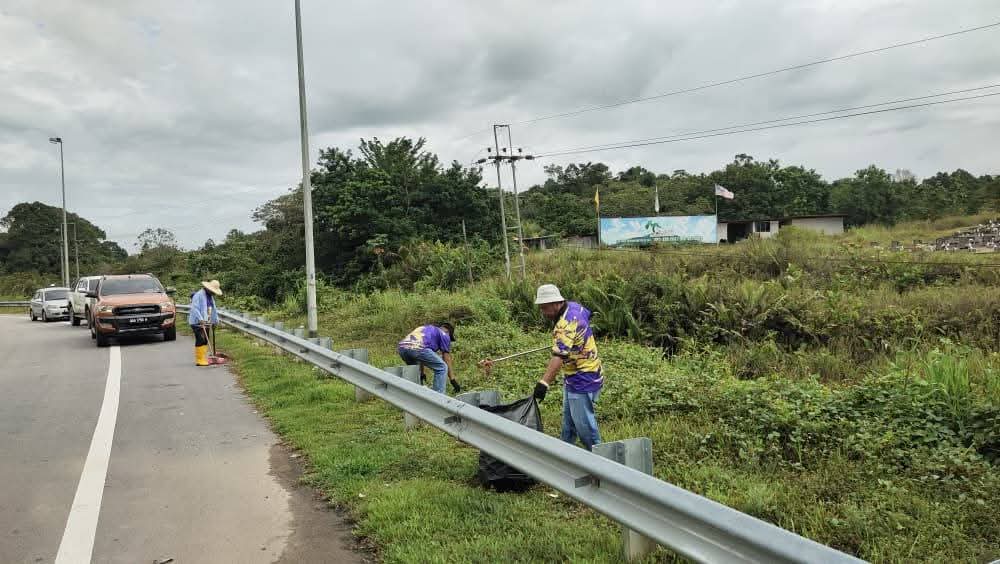 SARATOK: Seramai 38 Tuai Rumah bersama seorang Penghulu berganding bahu menjayakan aktiviti gotong-royong mengumpul sampah di sepanjang laluan Perhentian Bas dan Pusingan P (P-Turn) di Lebuh Raya Pan Borneo dekat kawasan Awik, pagi tadi.