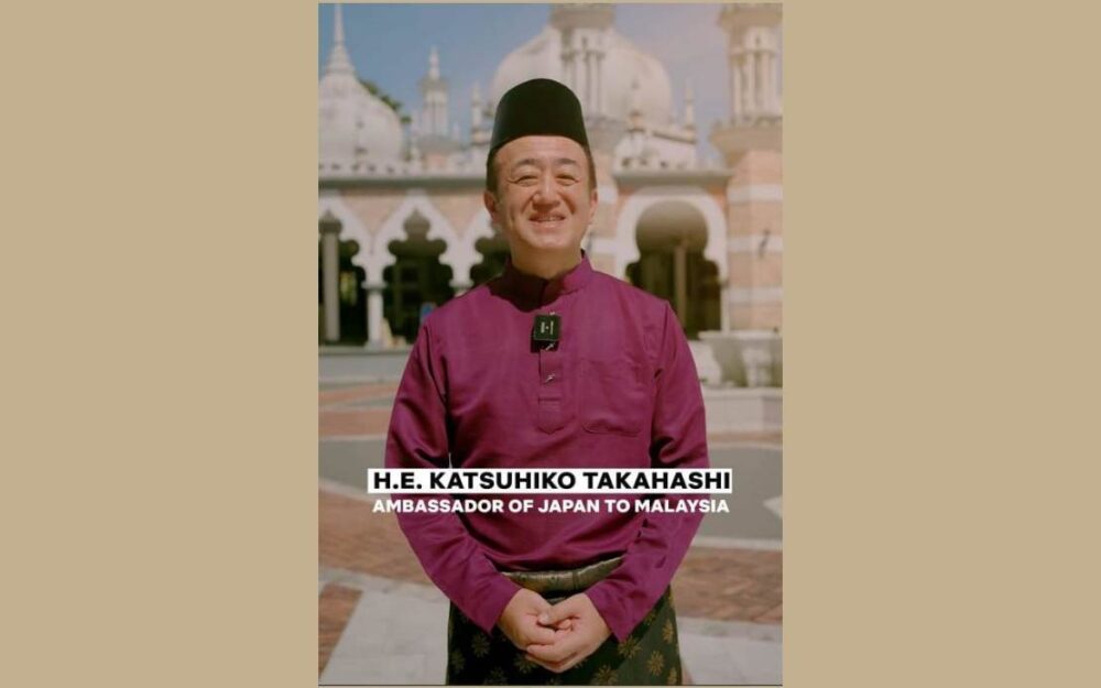 Mengenakan baju Melayu dan songkok, Duta Jepun ke Malaysia Takahashi Katsuhiko menyampaikan ucapan tulus ikhlas kepada rakyat Malaysia sempena Hari Raya Aidilfitri yang penuh keberkatan.