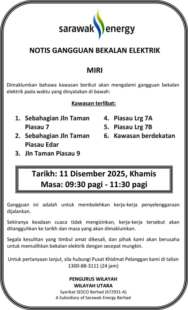 IKLAN Khamis, 11-12 Disember 2025, SEB Notis Gangguan Bekalan Elektrik Miri (Jln Taman Piasau) Utusan Sarawak 10 hours ago