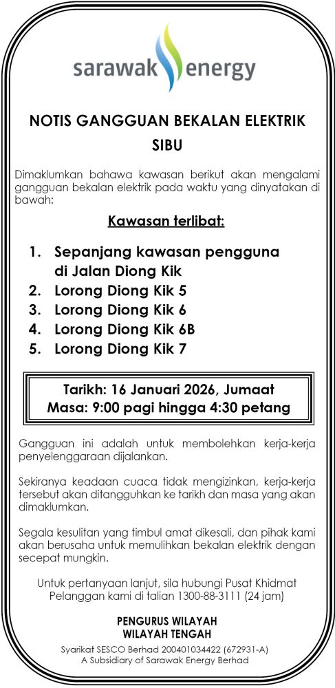 IKLAN Khamis, 15-16 Januari 2026, SEB Notis Gangguan Bekalan Elektrik Sibu Utusan Sarawak 4 hours ago Continue Reading Previous: Rabu, 14-15 Januari 2026, SEB Notis Gangguan Bekalan Elektrik KuchingNext: Khamis, 15 Januari 2026, SEB Notis Gangguan Bekalan Elektrik Miri (Sg Rait)