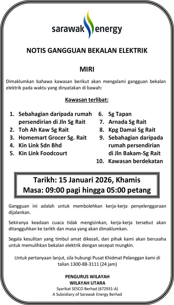 IKLAN Khamis, 15 Januari 2026, SEB Notis Gangguan Bekalan Elektrik Miri (Sg Rait) Utusan Sarawak 3 hours ago Continue Reading Previous: Khamis, 15-16 Januari 2026, SEB Notis Gangguan Bekalan Elektrik Sibu