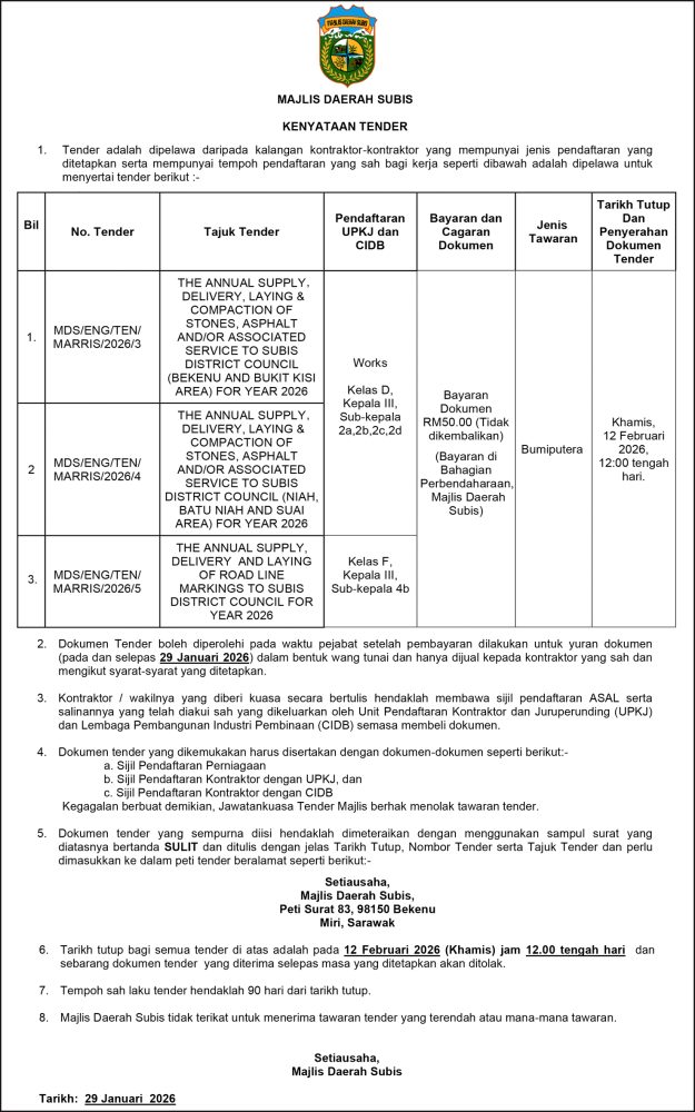 IKLAN Khamis, 29 Januari 2026, Majlis Daerah Subis, Kenyataan Tender Utusan Sarawak 4 hours ago ” Continue Reading Previous: Khamis, 29-30 Januari 2026, SEB Notis Gangguan Bekalan Elektrik Kota Samarahan