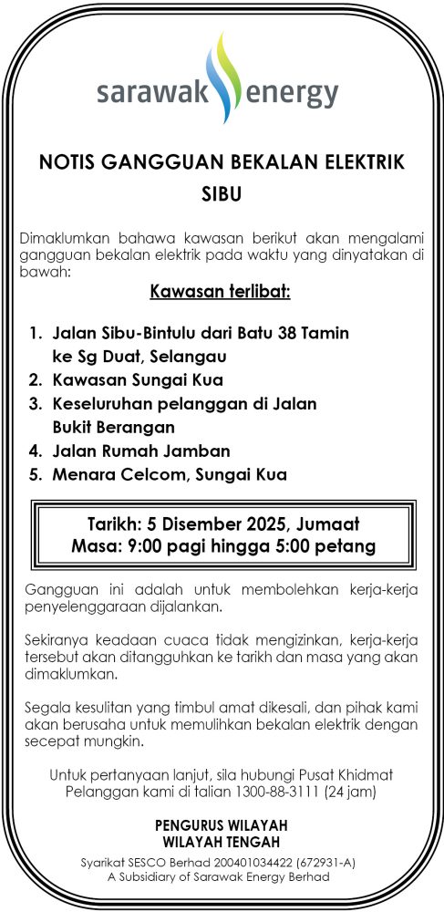 IKLAN Khamis, 4-5 Disember 2025, SEB Notis Gangguan Bekalan Elektrik Sibu Utusan Sarawak 2 hours ago Continue Reading Previous: Khamis, 4-5 Disember 2025, SEB Notis Gangguan Bekalan Elektrik MiriNext: Khamis, 4-5 Disember 2025, SEB Notis Gangguan Bekalan Elektrik Miri (Grace Garden Luak)