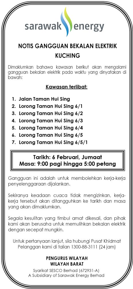 IKLAN Khamis, 5-6 Februari 2026, SEB Notis Gangguan Bekalan Elektrik Kuching Utusan Sarawak 11 hours ago