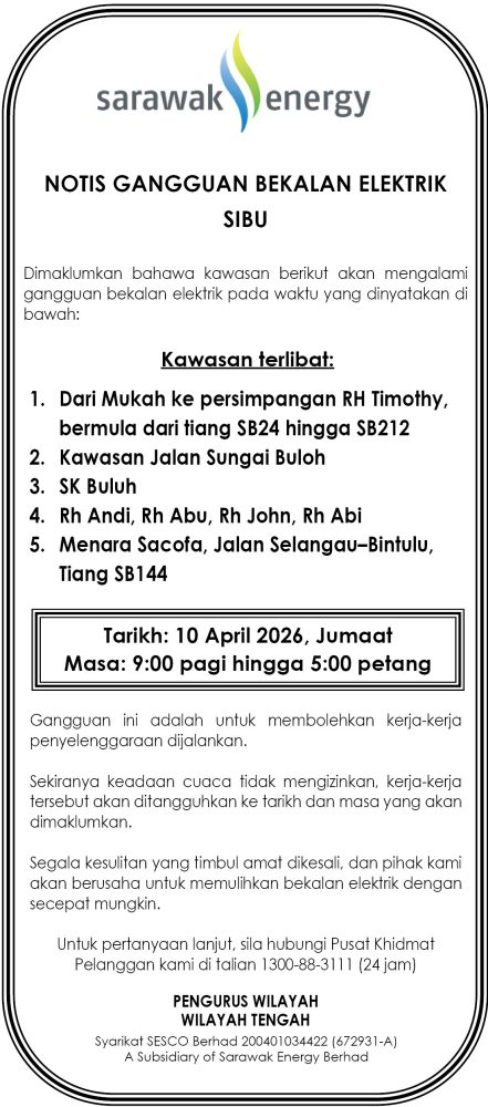 IKLAN Khamis, 9-10 April, 2026, SEB Notis Gangguan Bekalan Elektrik Sibu Utusan Sarawak 8 hours ago Continue Reading Previous: Rabu, 8 April 2026, Majlis Daerah Limbang, Kenyataan TenderNext: Khamis, 9 April 2026, MBKS, Notis Tender, Kuching Festival Fair