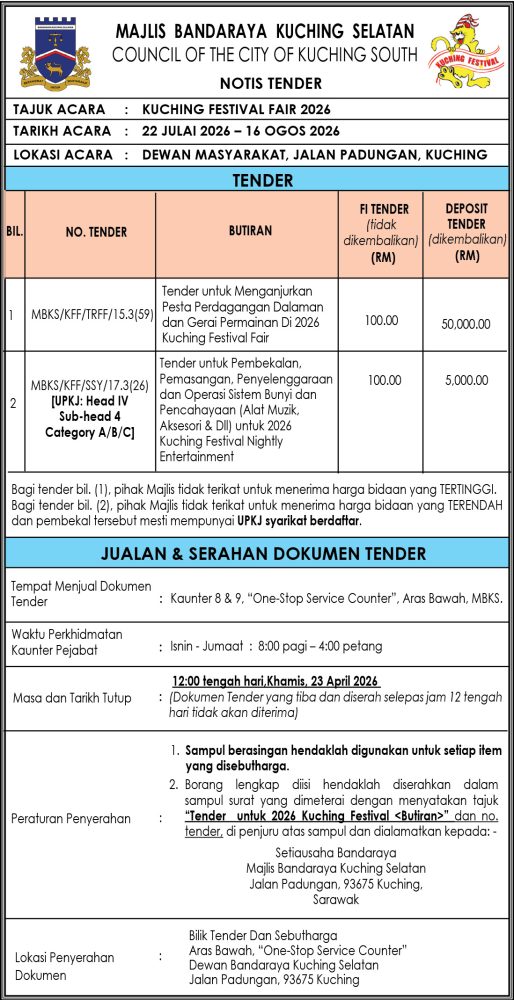 IKLAN Khamis, 9 April 2026, MBKS, Notis Tender, Kuching Festival Fair Utusan Sarawak 7 hours ago Continue Reading Previous: Khamis, 9-10 April, 2026, SEB Notis Gangguan Bekalan Elektrik SibuNext: Jumaat, 10-11 April 2026, SEB Notis Gangguan Bekalan Elektrik Sarikei