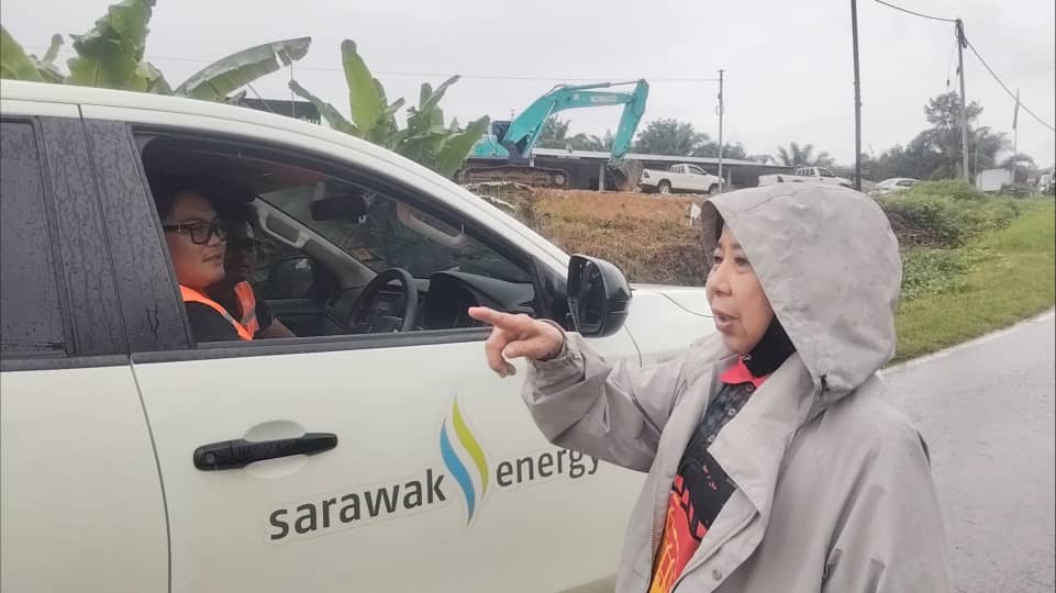 PANTAU… Datuk Rosey Yunus ketika menemui pihak Sarawak Energy Berhad yang juga melakukan pemantauan di sekitar Daerah Subis hari ini.