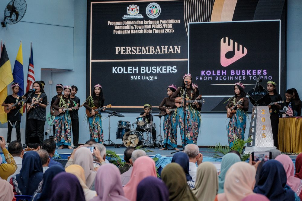 KUMPULAN Koleh Buskers, yang terdiri daripada murid Orang Asli suku Jakun, telah membuat persembahan pada Majlis Perasmian Penutup Program Jalinan dan Jaringan Pendidikan Komuniti serta Town Hall PIBKS/PIBG Peringkat Daerah Kota Tinggi 2025 di Kolej Vokasional Kota Tinggi baru-baru ini. Koleh Buskers berjaya meraih tempat kedua dalam Malaysia Ukulele Song Competition (MUSC) 2024 dan menempatkan diri di tangga kelima tahun ini, daripada 20 sekolah yang bertanding. Foto BERNAMA