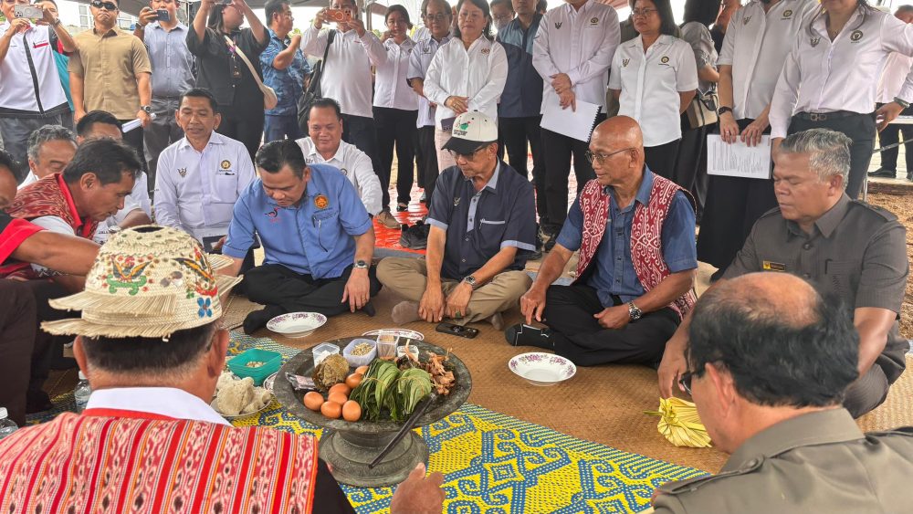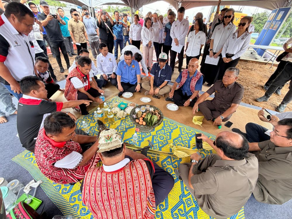 MOHON BERKAT…Karim bersama Gira serta tetamu kenamaan lain pada upacara miring majlis pecah tanah projek pembinaan Kompleks Sukan Mini Selangau, hari ini.