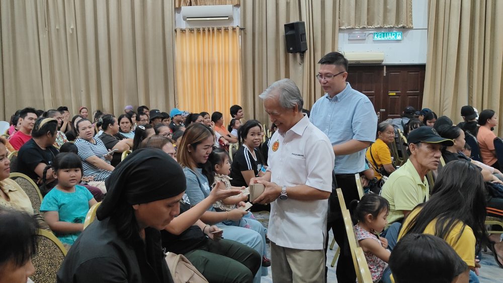 KEMASYARAKATAN… Dato Paulus dan Kenneth menyerahkan sumbangan Krismas kepada para penerima.