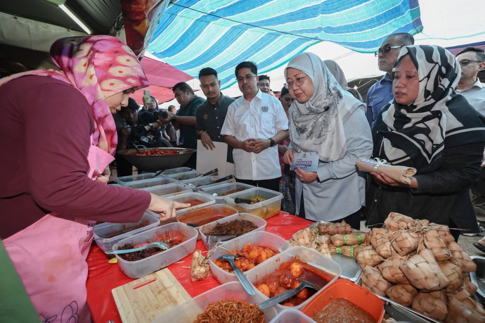 TIMBALAN Menteri Perdagangan Dalam Negeri dan Kos Sara Hidup Datuk Dr Fuziah Salleh (dua kanan) menyantuni peniaga yang menawarkan Menu Rahmah di Bazar Ramadan sempena Majlis Pelancaran Bazar Ramadan RAHMAH MADANI Peringkat Kebangsaan dan I-FB@BRR 2026 di Perling Mall, Taman Perling, hari ini. Foto Bernama