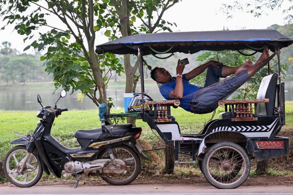 SEORANG pemandu tuk-tuk berbaring di atas buaian sementara menunggu pelancong kembali dari lawatan ke Kuil Angkor Wat di wilayah Siem Reap. Foto AFP