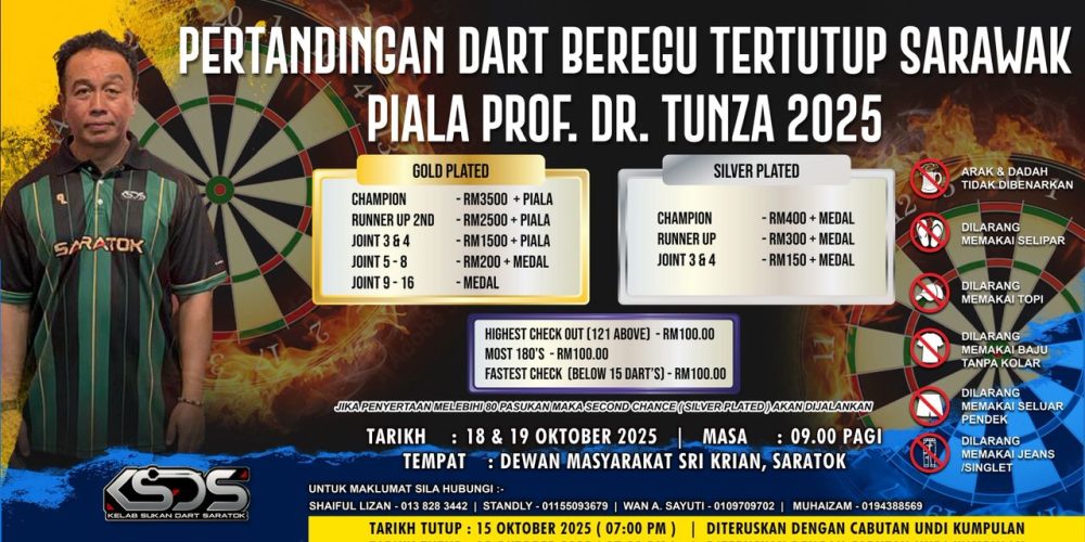 SARATOK: Kelab Sukan Dart Saratok (KSDS) akan menganjurkan Pertandingan Dart Beregu Tertutup Sarawak Piala Prof. Dr Tunza 2025 di Dewan Masyarakat Sri Krian pada 18 dan 19 Oktober ini, bermula 9.00 pagi.