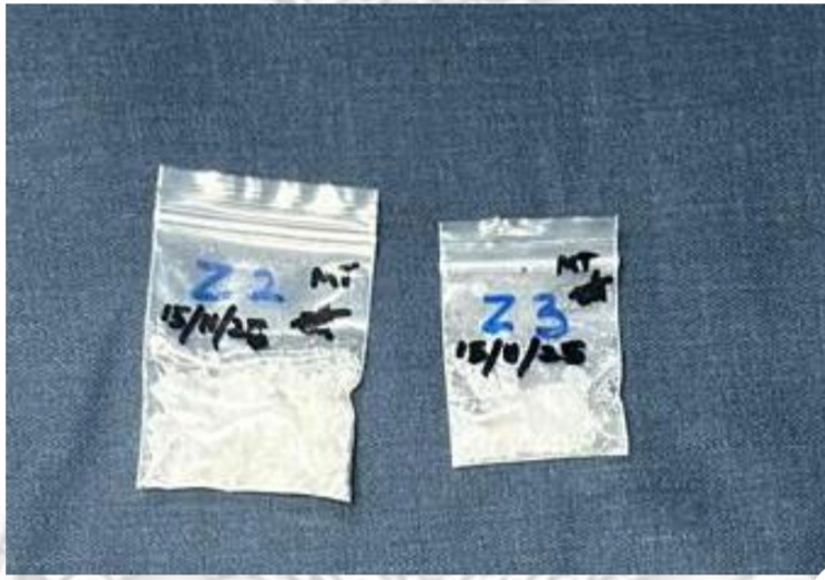 A search on both suspects led to the discovery of two packets of transparent plastic containing crystal like substances believed to be methamphetamine.