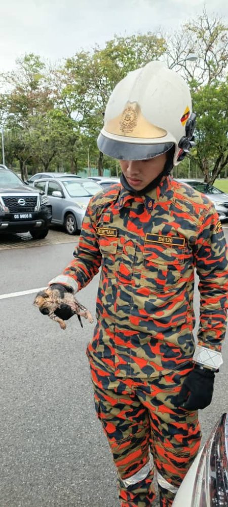 “Pasukan bomba  mendapati kucing berkenaan tersepit di celah ruang enjin sebelum anggota bertindak menggunakan peralatan khas bagi mengeluarkannya.