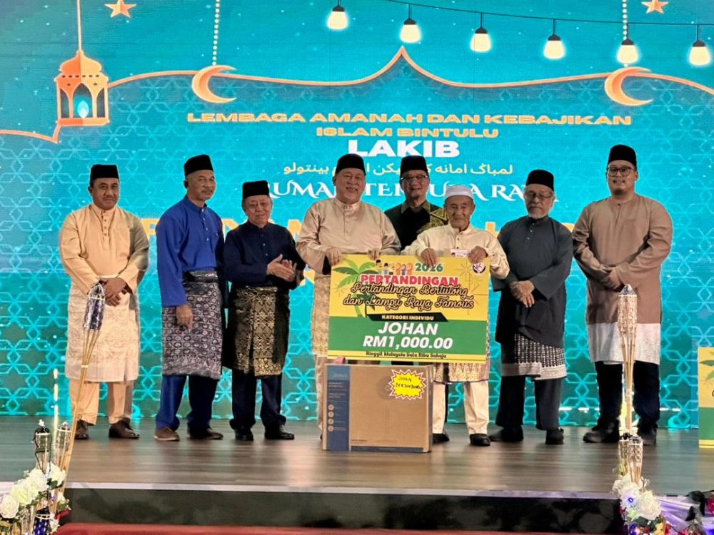 ISKANDAR Turkee menyampaikan hadiah kepada pemenang Pertandingan Bertuntung dan Lampu Raya sempena Majlis Ramah Tamah Aidilfitri LAKIB 2026 di Dewan Suarah Bintulu.