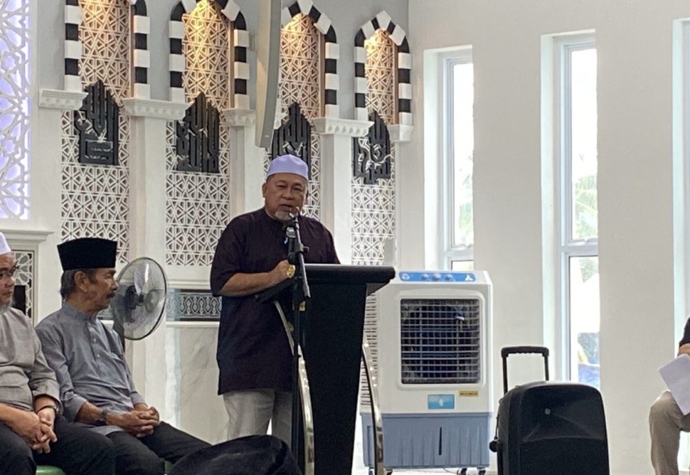 UCAPAN… Iskandar Turkee menyampaikan ucapan pada majlis Penyerahan Sumbangan Aktiviti Pengimarahan Hari Raya Korban di Surau Darussyakirin, Kampung Assyakirin, hari ini.