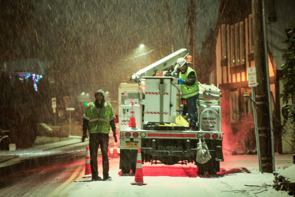 PEKERJA utiliti menjalankan tugas ketika salji turun pada 26 Disember 2025 di Piermont, New York. Foto AFP