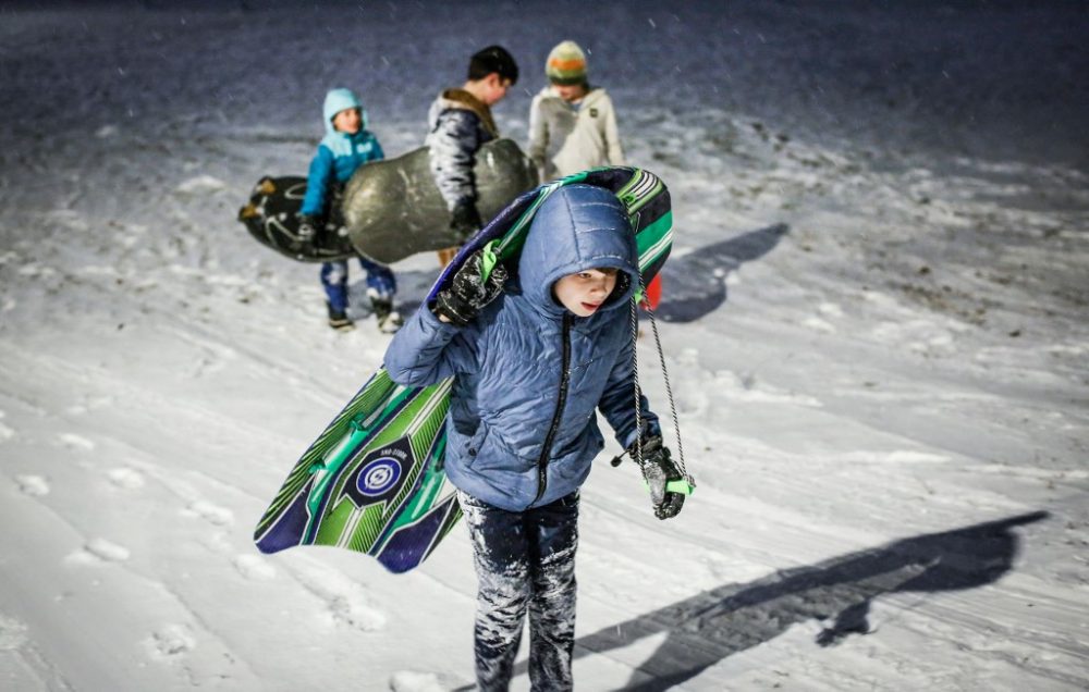KANAK-kanak bermain salji ketika salji turun pada 26 Disember 2025. Foto AFP