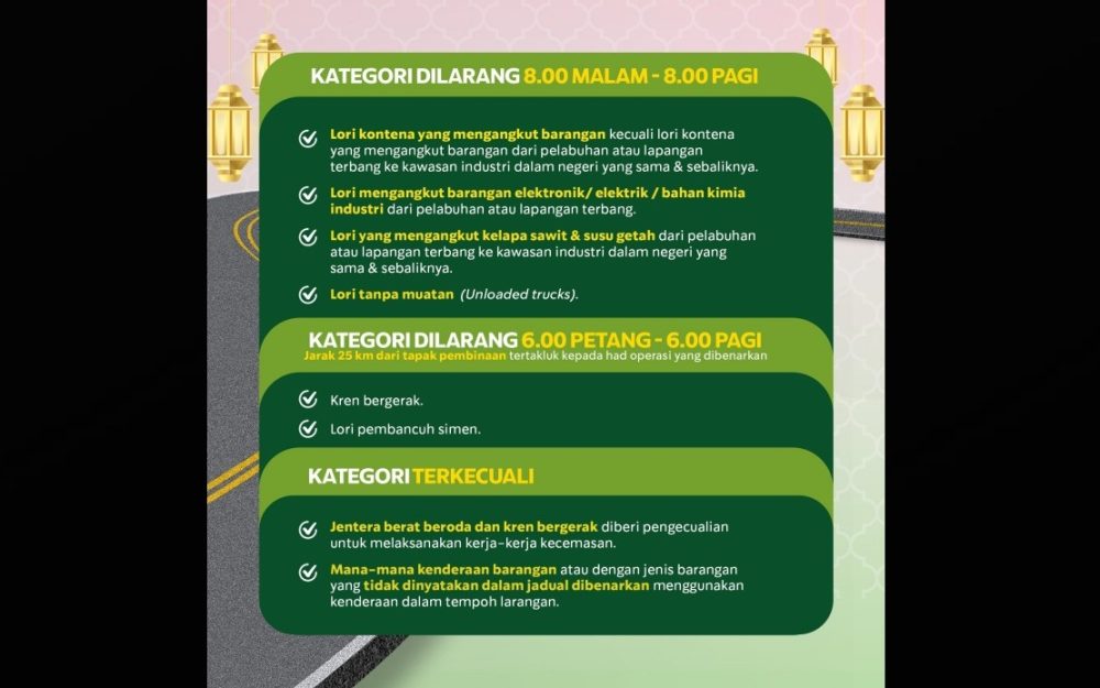 Dalam hantaran berasingan, kementerian itu memaklumkan bagaimanapun, beberapa kategori kenderaan berat dibenarkan beroperasi dengan had masa tertentu pada tarikh berkenaan antaranya lori kontena dan kargo, iaitu dari 8.00 pagi hingga 8.00 malam, manakala kenderaan pembinaan pula bermula pada 6.00 pagi hingga 6.00 petang dalam lingkungan 25 kilometer.