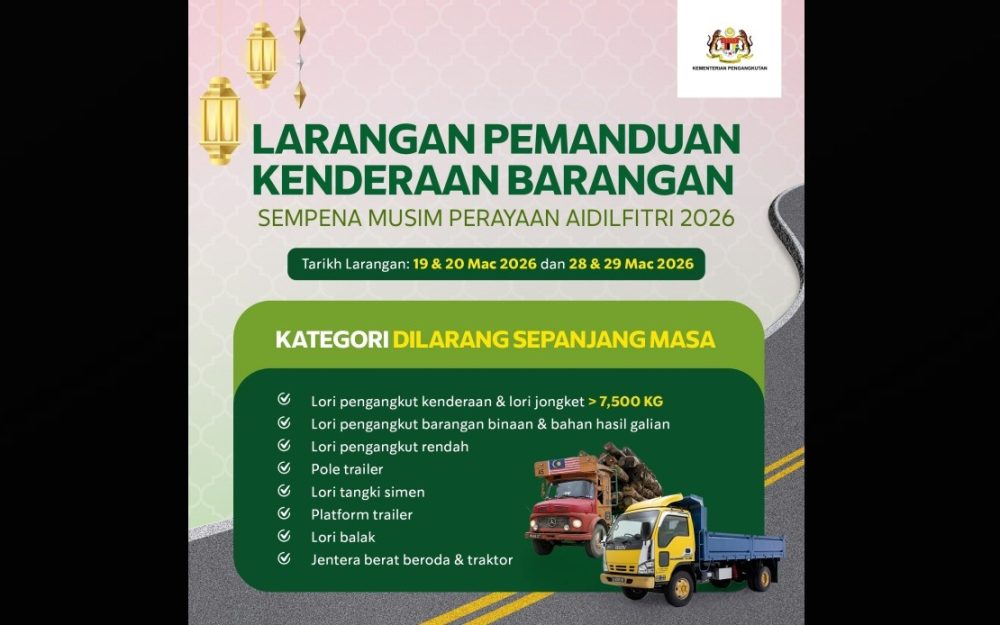 Kementerian Pengangkutan (MOT) memaklumkan larangan itu bagi memastikan kelancaran trafik, mengurangkan risiko kemalangan serta menjadikan perjalanan pulang ke kampung lebih selesa dan selamat, selaras dengan aspirasi Malaysia MADANI.