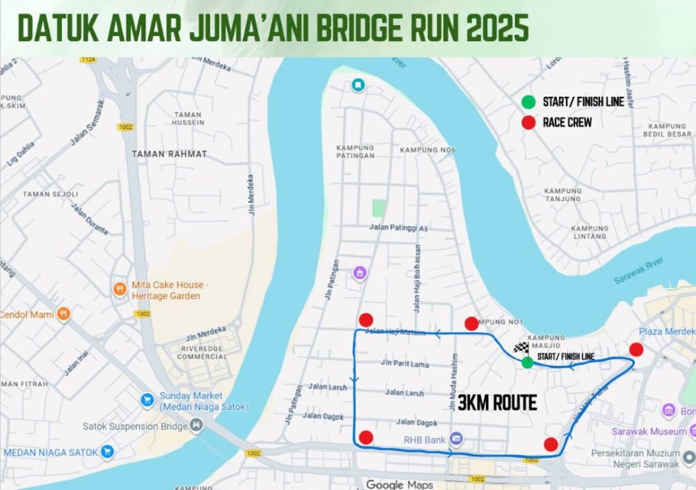 Sementara itu Moderator Acara, Abang Nawawi Bolhassan berkata, bagi kategori 3 km, larian bermula di Jambatan Datuk Amar Juma’ani dan melalui laluan sepanjang Jalan Patinggi Ali, Jalan Matang, Jalan Parit Lama, Jalan Laruh serta Jalan Dagok sebelum kembali ke garisan penamat.
