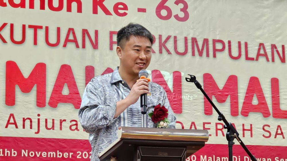 UCAPAN….Datuk Larry Sng Wei Shien berucap pada majlis makan malam amal sempena sambutan ulang tahun ke-63 PPWS yang diadakan di Dewan Sentral Sarikei, malam tadi.