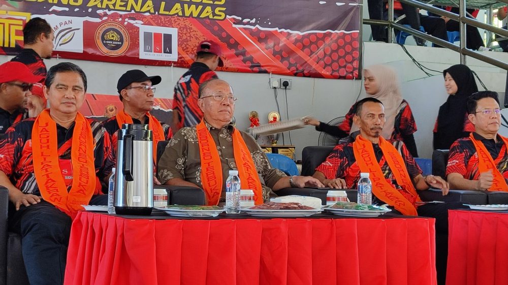 LAWAS BERPOTENSI.. (dari kiri) Awangku Jinal Abedin, Henry Sum Agong menyaksikan perlawanan akhir Kejohanan Lipat Takraw SeBorneo Terbuka 2025 Piala Datuk Amar Awang Tengah Ali Hasan di Arena Lawas, semalam.