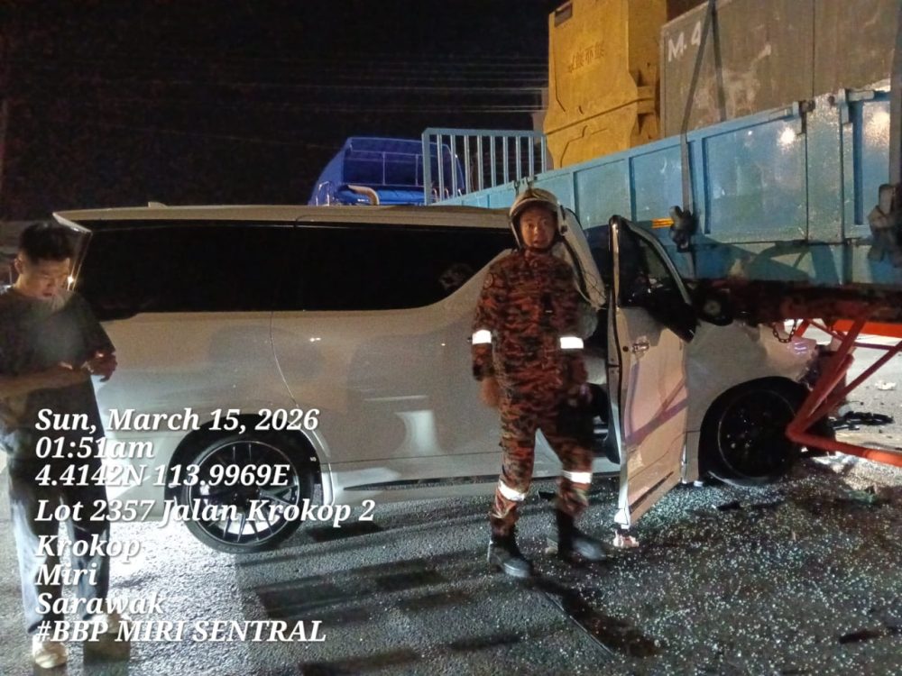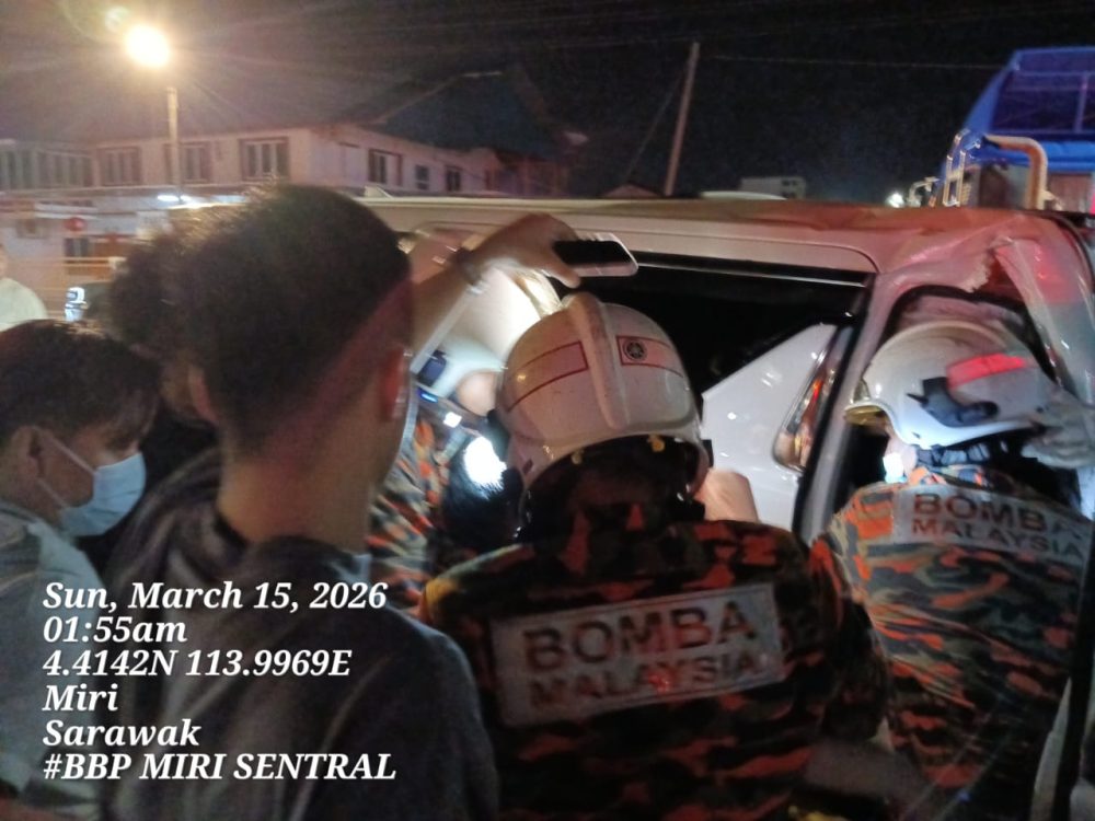 TERPERANGKAP…Anggota bomba mengeluarkan seorang lelaki yang terperangkap selepas MPV dipandunya merempuh belakang treler dalam kemalangan di Jalan Krokop Utama, Miri awal pagi tadi.