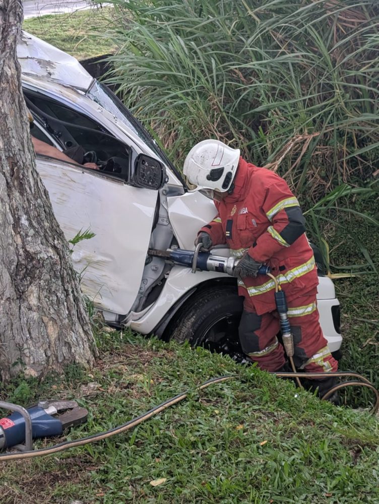 “Setibanya di tempat kejadian pada 3.40 petang, pasukan bomba mendapati kemalangan kendiri melibatkan sebuah kenderaan pacuan empat roda yang terbabas ke dalam parit selepas melanggar pokok.