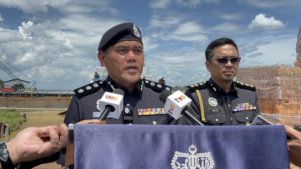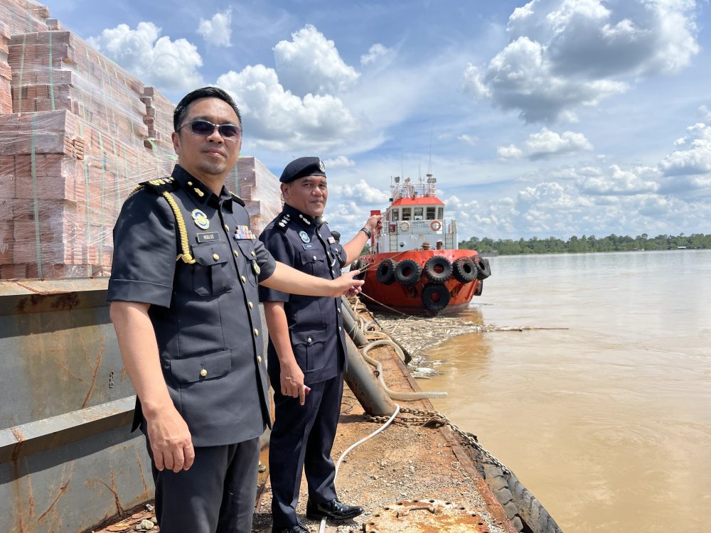 KETUA Cawangan KPDN Sibu, Roslee Masli (kiri) dan Ketua Polis Daerah Sibu, ACP Azari Miskon menunjukkan kapal tunda Sinar Pelutan 1 yang diserbu dalam operasi membanteras penyelewengan diesel bersubsidi di jeti Sarawak Chemical Industries, Ulu Lanang di Sibu, hari ini.