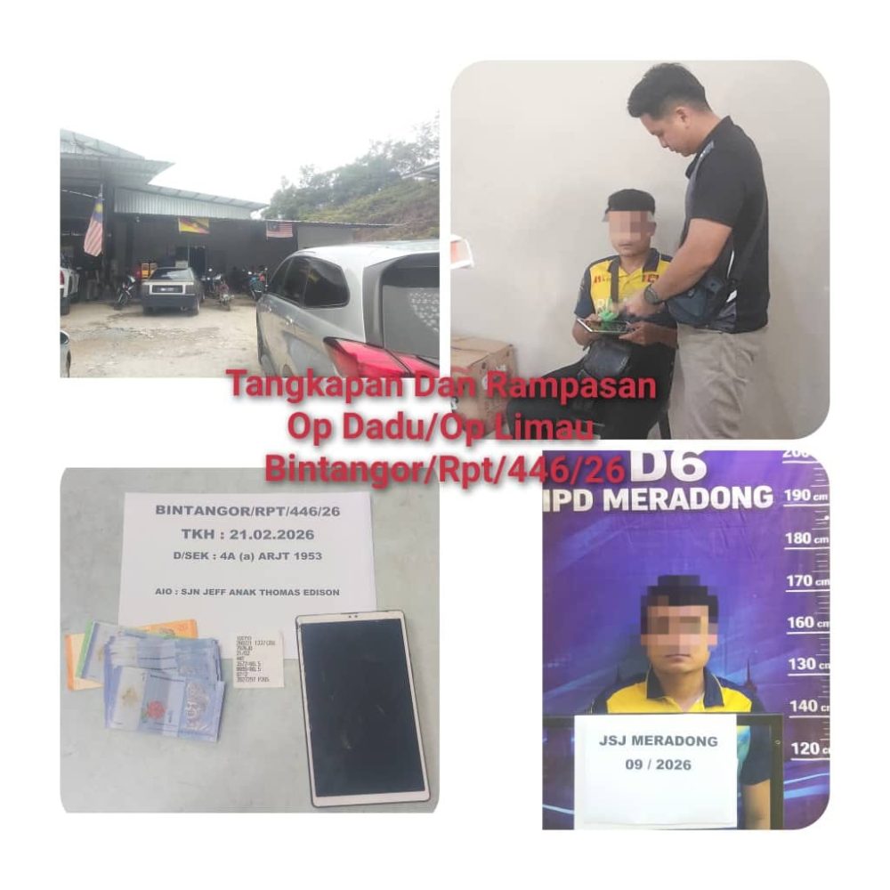 “Antara barang kes yang dirampas dari subjek adalah satu unit tab jenama Samsung, keratan kertas bercetak angka-angka disyaki nombor loteri awam tanpa lesen dan sejumlah wang tunai.