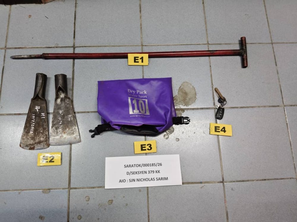 Polis turut merampas sebuah kenderaan jenis Mitsubishi Triton berwarna hitam bersama satu kunci dan alat kawalan jauh, sebatang spike tojok buah sawit, dua bilah mata tombak, dua tandan buah sawit serta sebuah beg silang kalis air berwarna ungu.