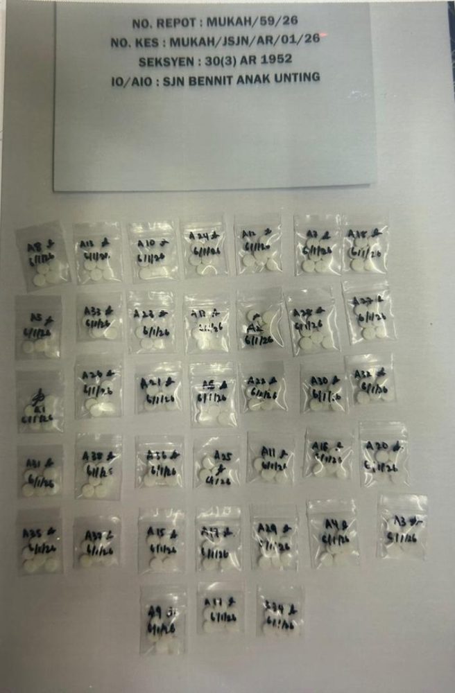 “Pemeriksaan yang dijalankan telah menjumpai 38 paket plastik lutsinar yang masing-masing mengandungi enam biji pil palang berwarna putih disyaki pil nospan.