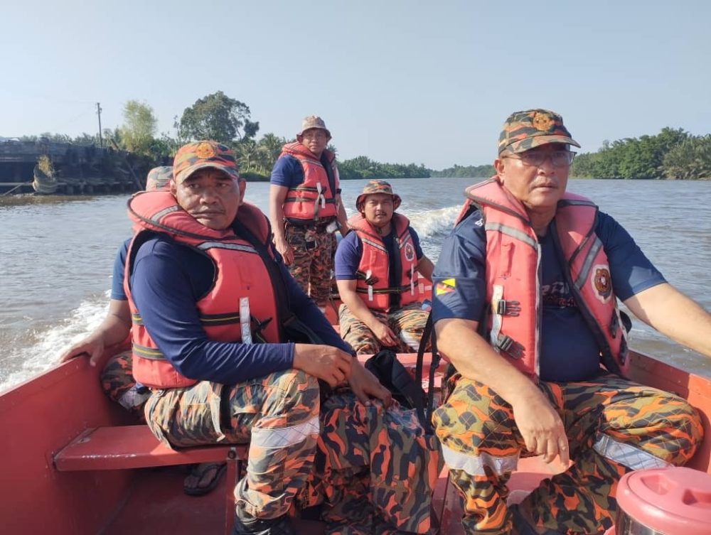 MENCARI…Operasi SAR yang dijalankan oleh anggota bomba menggunakan aset marin ALB Bomba 01 dan bot APM, meliputi kawasan 1km dari muara Sungai Sedupai ke hilir pada hari ini.